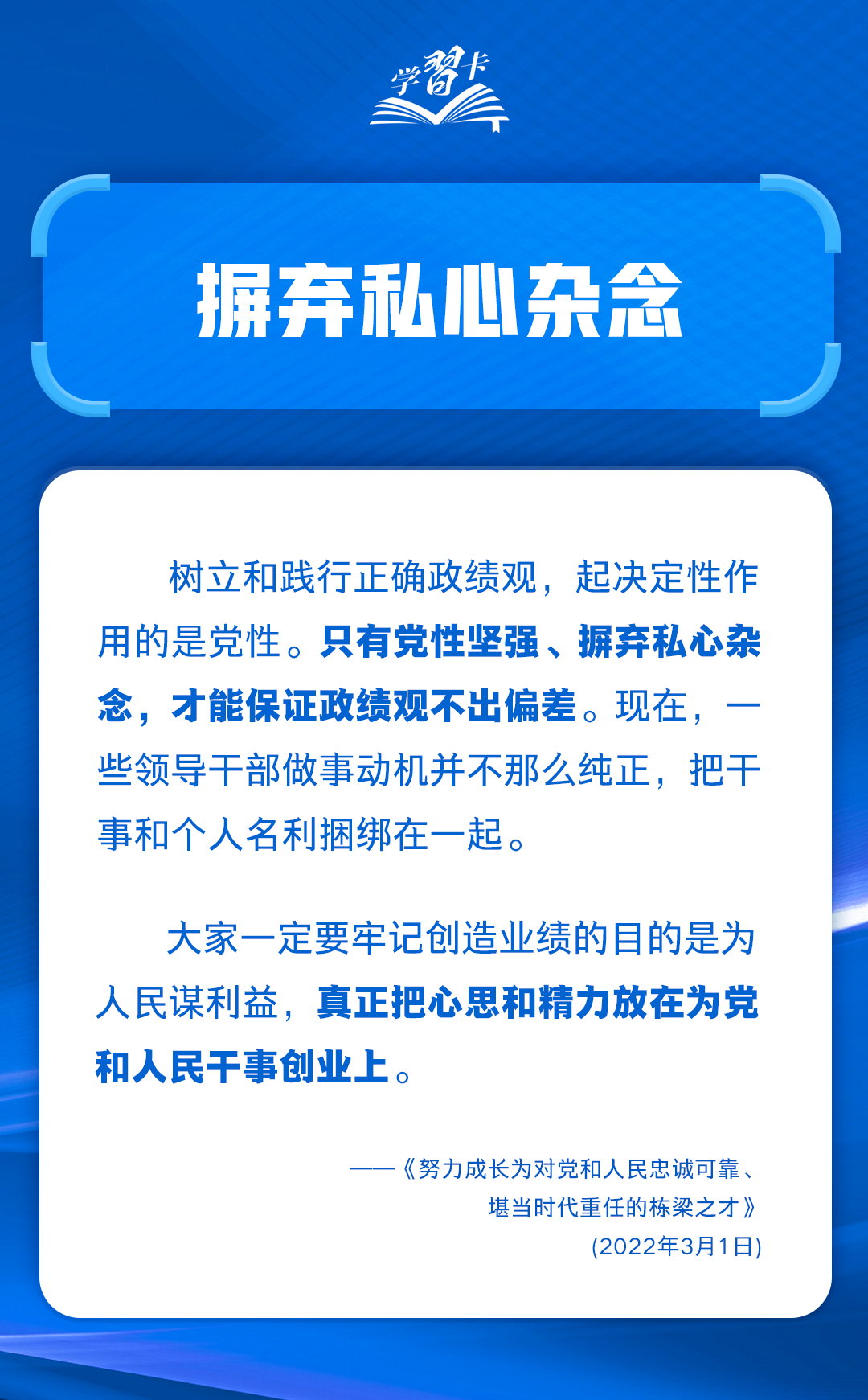 樹立和踐行正確政績(jī)觀,起決定性作用的是黨性。立黨為公,作為共產(chǎn)黨員,作為黨的干部,只有一心為公,事事出于公心,才能有正確的是非觀、義利觀、權(quán)力觀、事業(yè)觀。